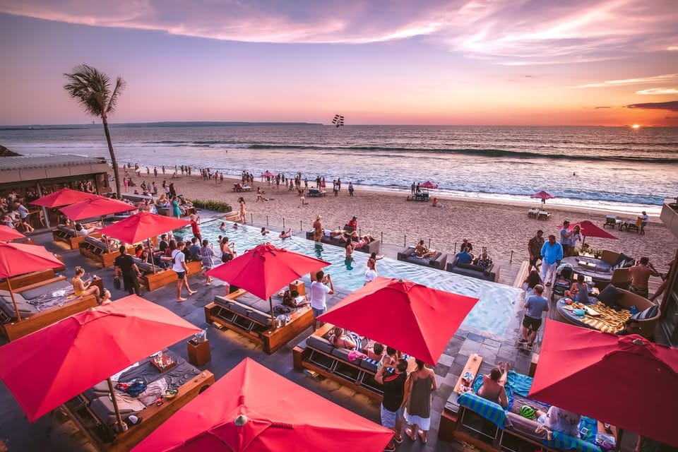 For a more refined sunset experience, KU DE TA remains a staple. The beachside deck offers a front row seat to the sky show, complete with curated cocktails and a touch of old school Bali glam. Learn more